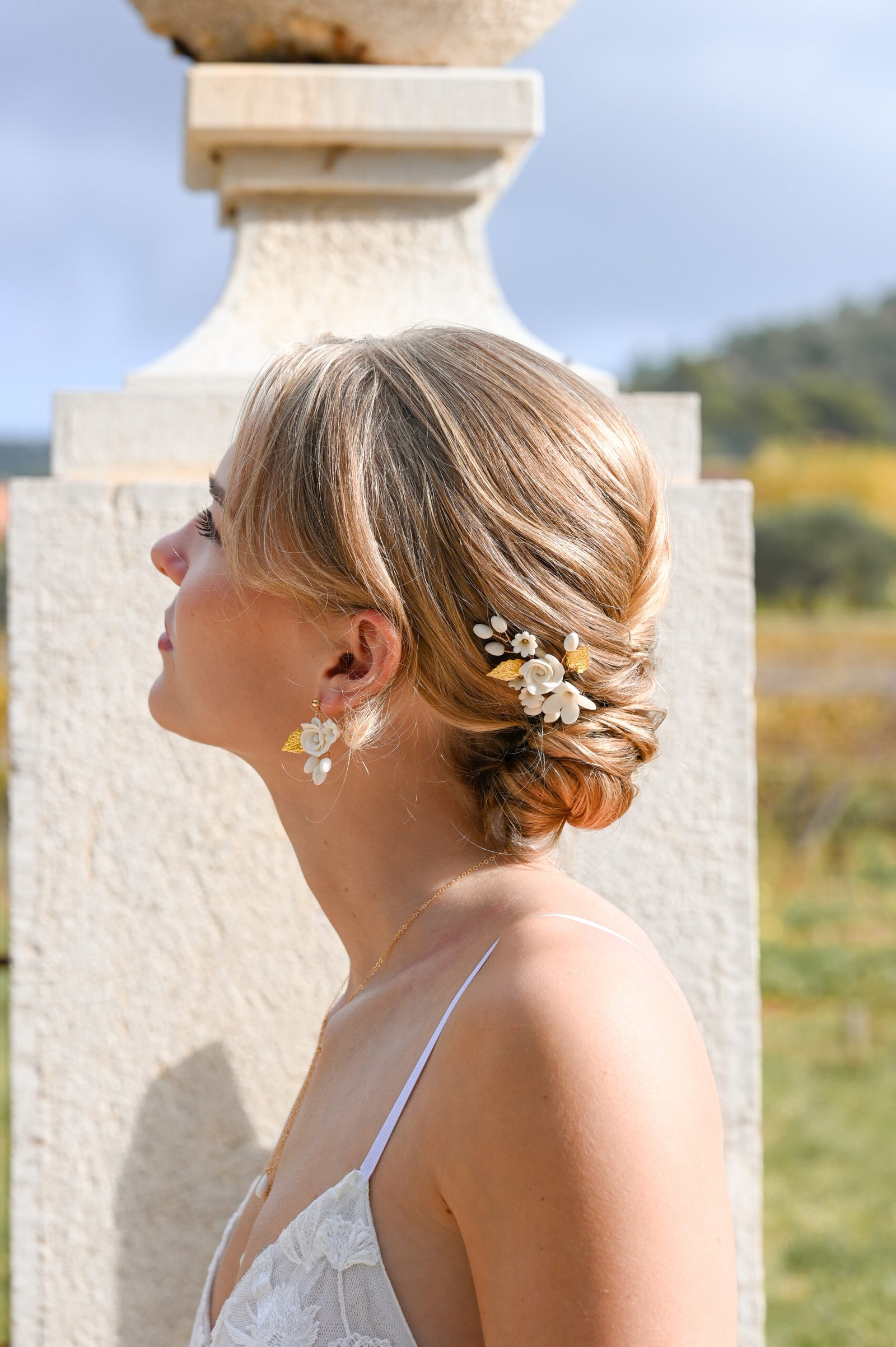 La Pince Plate Colombe allie simplicité et raffinement avec sa composition florale montée sur une pince plate. Les feuilles dorées et les fleurs blanches en porcelaine froide offrent un accent délicat, parfait pour agrémenter les coiffures lors de grandes occasions ou au quotidien. Cette pince discrète et facile à poser, s’adapte à tous styles de coiffures.